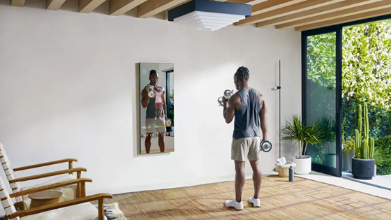 Lululemon’s “Mirror” interactive fitness device (now discontinued) being used for at-home strength training. LULU took swift action to pivot away from hardware and focus on core apparel and community offerings.
