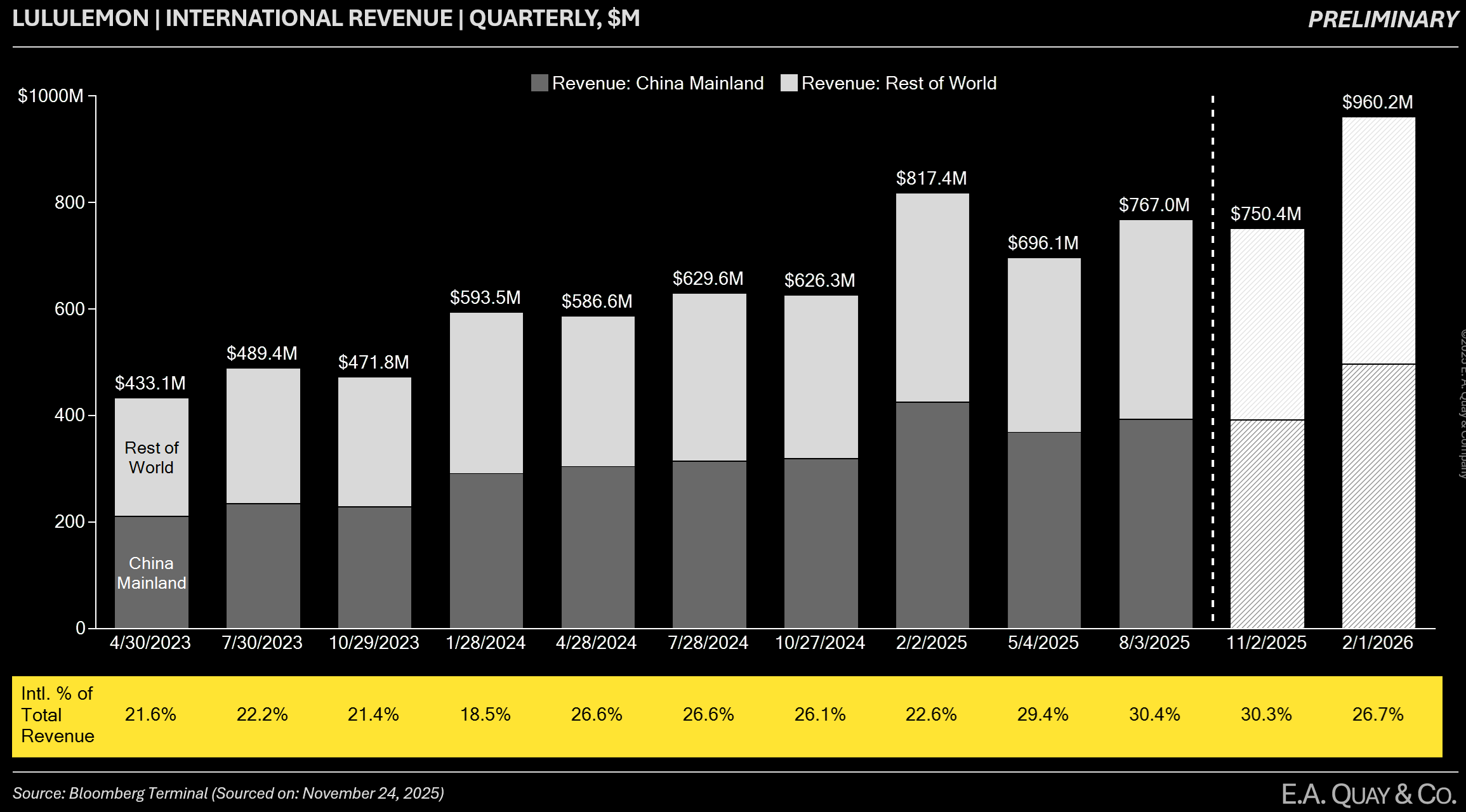 Lululemon’s international business is on fire – and it’s just getting started. While skeptics fixate on a maturing U.S. market, LULU’s overseas segment (from Asia to Europe) is scaling at extraordinary rates, dramatically shifting the company’s mix. In the most recent quarter, international sales jumped +49% year-on-year, and for full-year 2024 they surged 34% (36% in constant currency) – vastly outpacing the 4% growth in North America. International now represents roughly 26% of LULU’s revenue (FY2024), up from just ~15% in 2021. Management’s Power of Three ×2 plan explicitly targets a quadrupling of international revenue from 2021 to 2026, and current trends show LULU is well on track, if not ahead, of that ambitious goal. The market, in our view, does not fully appreciate how powerful this international momentum is – especially in China, where Lululemon is emerging as a status symbol and athletic staple for affluent consumers.