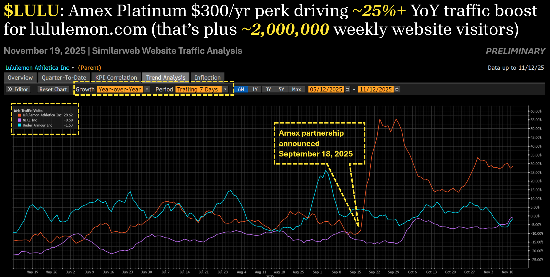 Crucially, the economics are attractive. The benefit is provided as a statement credit from Amex to the cardmember, so from Lululemon’s perspective these are standard full price transactions at full price channels. The quarterly cadence of the credit encourages habit — cardholders are nudged to visit lululemon.com or a store every three months or forfeit value — which shows up clearly in the data: Similarweb/Bloomberg traffic analysis indicates that following the launch, weekly visits to lululemon.com stepped up by roughly 25% year over year, or about +2 million incremental visitors per week, while Nike and Under Armour web traffic stayed flat to negative over the same window. In practical terms, Amex is now supporting a recurring influx of high income customers to LULU’s highest margin channels. Converting even a modest share of those Amex sourced customers into repeat customers should translate into meaningful incremental revenue over time — and further entrench Lululemon as the default premium athleisure brand for the very demographic that premium card issuers are fighting hardest to keep.